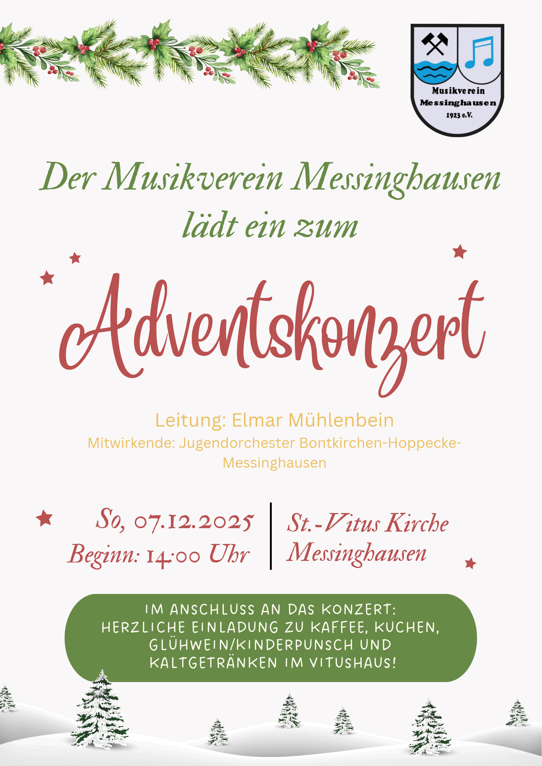 In diesem Jahr laden wir voller Vorfreude nach drei Jahren Pause zu unserem Adventskonzert in die St. Vitus Kirche Messinghausen ein. Unter der erstmaligen Leitung von Elmar Mühlenbein präsentieren wir vorweihnachtliche sowie konzertante Stücke, die eine besinnliche und festliche Stimmung in die Kirche zaubern werden. Besonders freuen wir uns auf das Jugendblasorchester Bontkirchen-Hoppecke-Messinghausen, welches unter der Leitung von Dominik Bunse unser Konzert musikalisch umrahmen wird.Im Anschluss laden wir alle Besucher und Gäste herzlich in das Vitushaus zu Kaffee/Kuchen/Glühwein sowie Kaltgetränken ein.